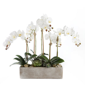 Modern meets timeless with our combination of the silk orchids that are real touch high quality phalaenopsis orchids with faux mini succulents. Ageless this arrangement stands at a regal height of 28" making it a perfect addition to your dining table, cocktail table, console table, kitchen island and even at work on the reception counter. Flowers stand tall and spray out towards the deep green of the mini echeveria, assorted other fake succulents, reindeer moss, and geodes. This masterfully arranged piece is finished off perfectly with the white wash rectangular cube stone pot that enhances the delicacy of the blooms. You will love having this display in your home or office!