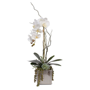 A versatile silk flower arrangements with a touch of modern sensibility. A single Real Touch White Orchid stretches over a variety of artificial Succulents and Leaves. Faux tendrils reach out from the back, adding a sense of spontaneity. A Silver Ceramic Pot anchors the piece, making it ideal for a variety of modern and traditional decor styles. Great for low-lit rooms with directional lighting as well as luminous spaces needing an extra flare. Pairs well with white metal decor and fixtures.