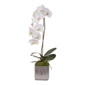 Jenny Silks White Real Touch Silk Phalaenopsis Orchid in Square Etched Silver Ceramic Pot #JS11