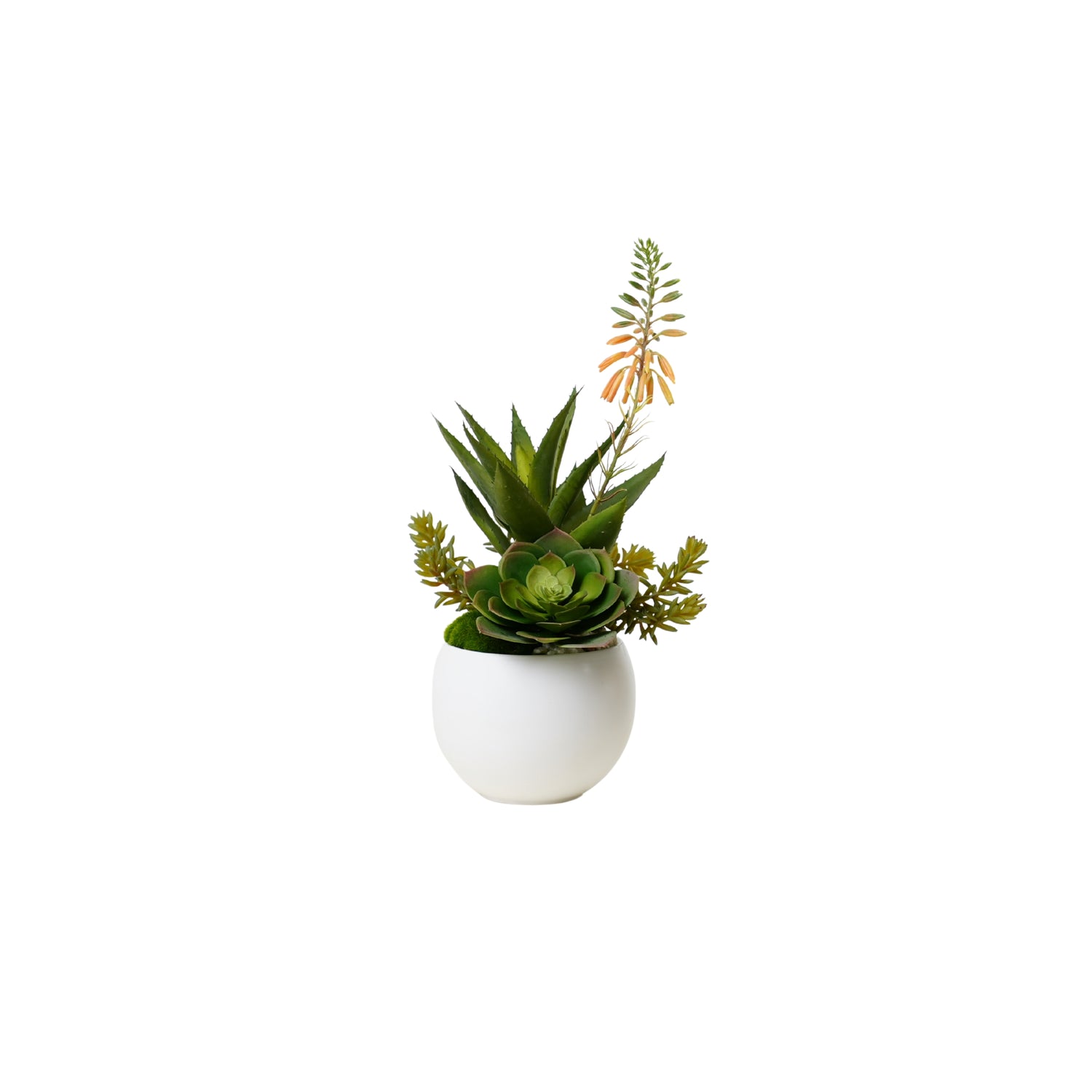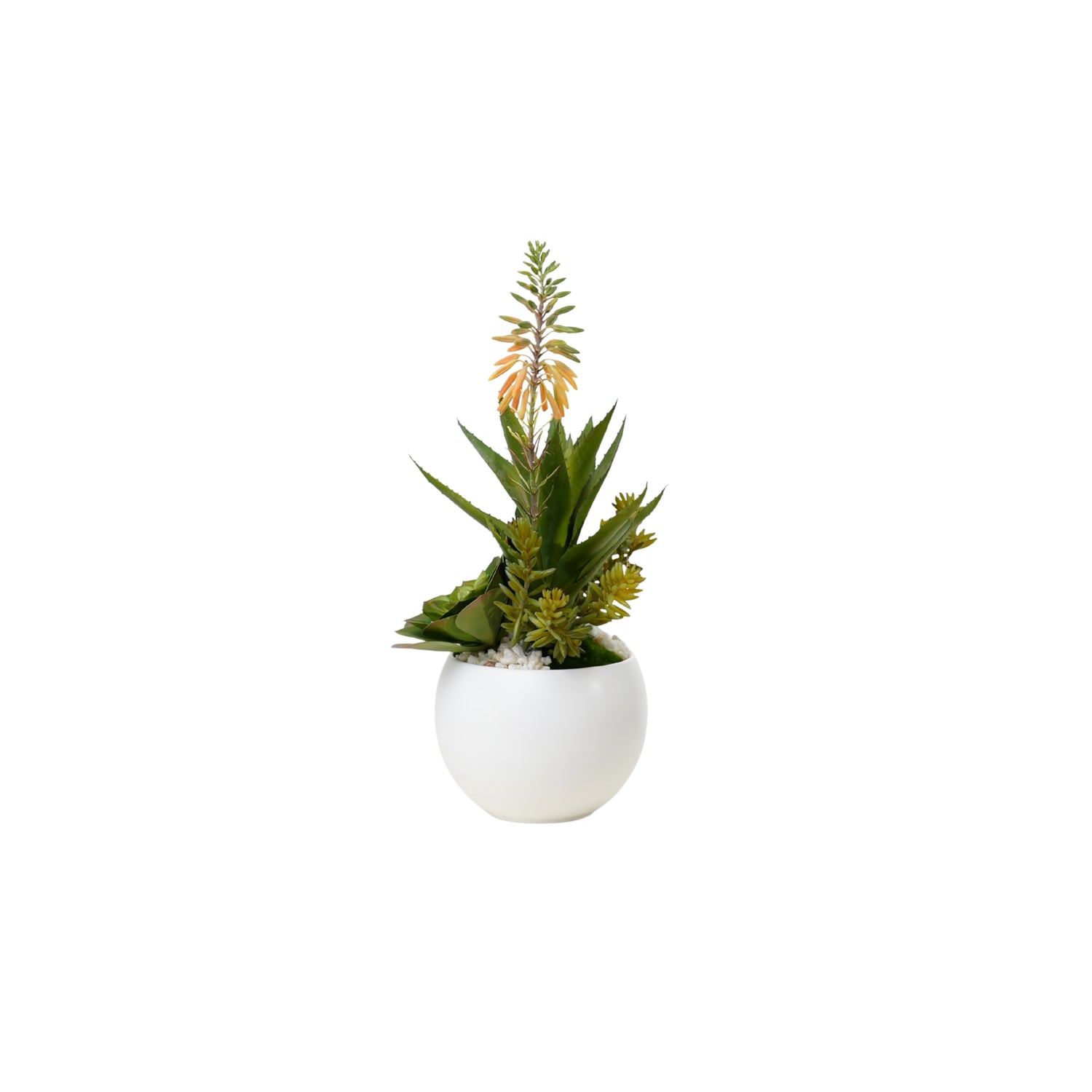 Transform your space with our stunning white ceramic sphere bowl, elegantly filled with a delightful mix of succulents and plants. Featuring a charming echeveria pick, a striking agave plant, and lush sedum, all nestled in faux moss and complemented by natural pebbles, this arrangement brings a touch of nature indoors without the maintenance. Perfect for your coffee table, reception area, end table, or even your desktop, it adds a modern, stylish flair to any setting. Elevate your decor effortlessly with this eye-catching centerpiece!