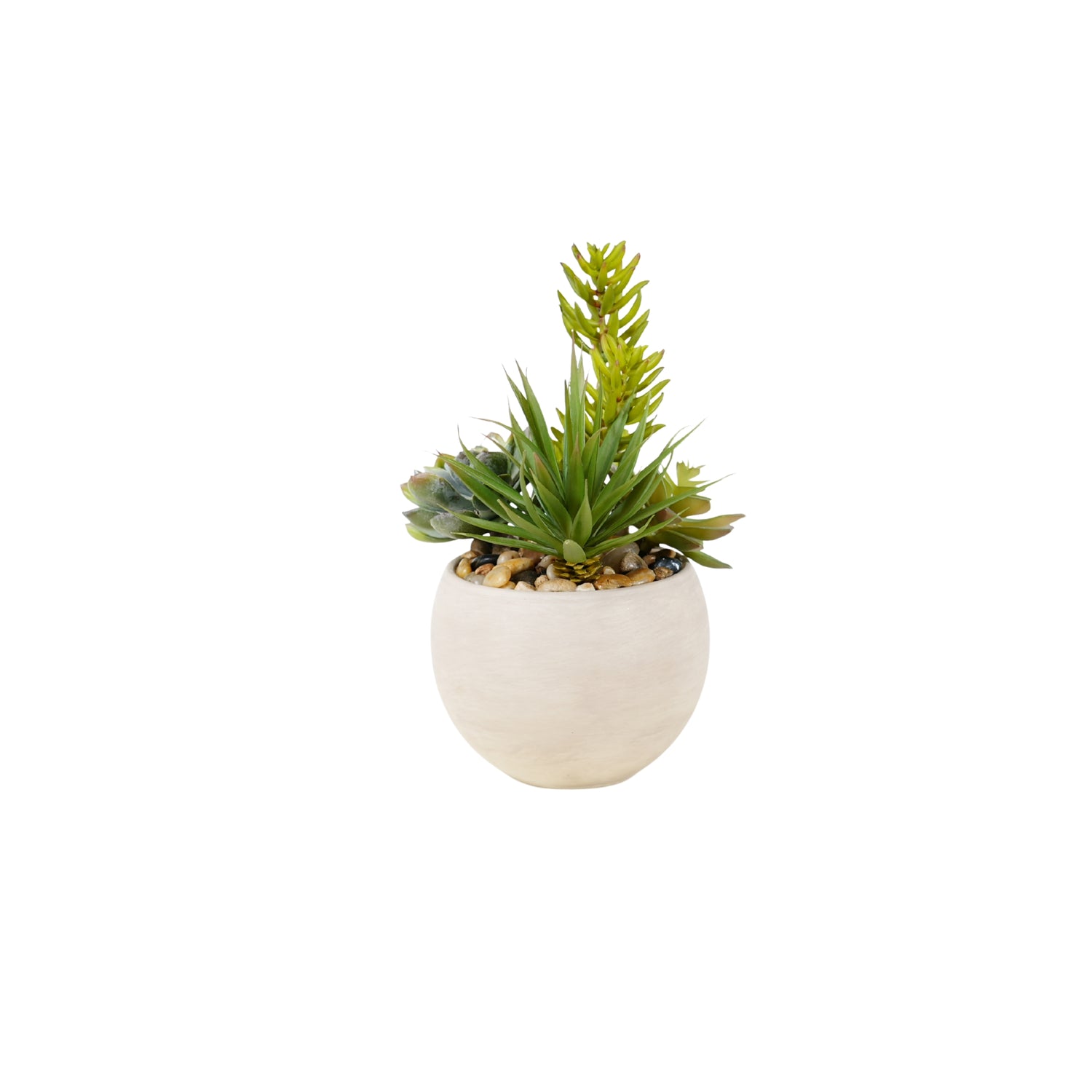 Looking to refresh your space? This modern succulent arrangement in a chic granite ceramic sphere is just what you need. Perfect for any spot - coffee table, desktop, or countertop. Enjoy low-maintenance greenery with yucca, echeveria, and sedum. Stone accents for added flair!